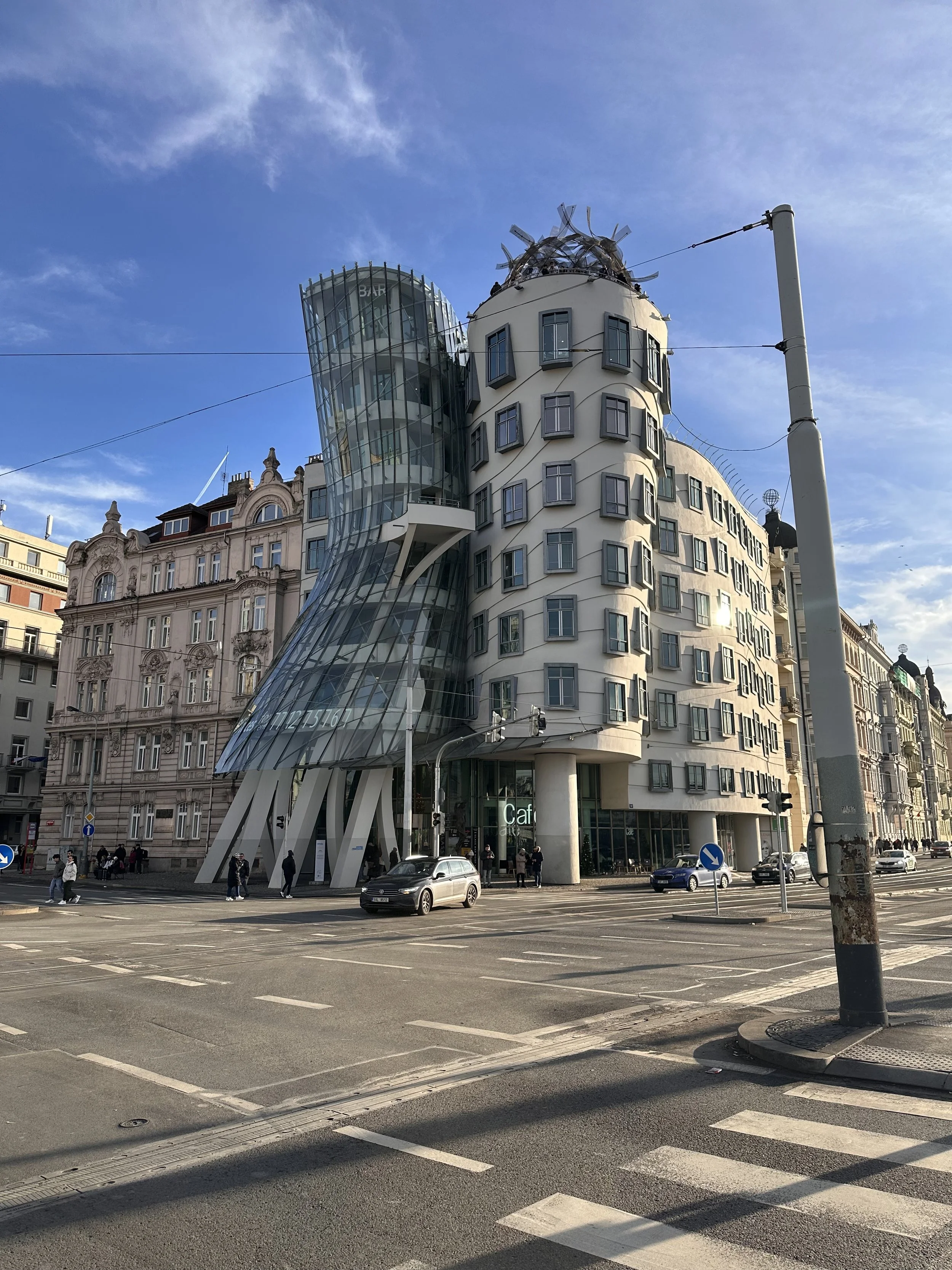 Completed in 1996, after four years of build time, the seven-story “Dancing House” is “home” to a hotel, restaurant, and rooftop bar. Co-architect, Frank Gehry, dubbed it “Fred and Ginger,” calling to mind the elegance and wit of the famous film couple. Some local residents, not so enamored with the radical design, dubbed it “The Drunk House,” calling to mind a boozy Saturday night along the Vltava River.