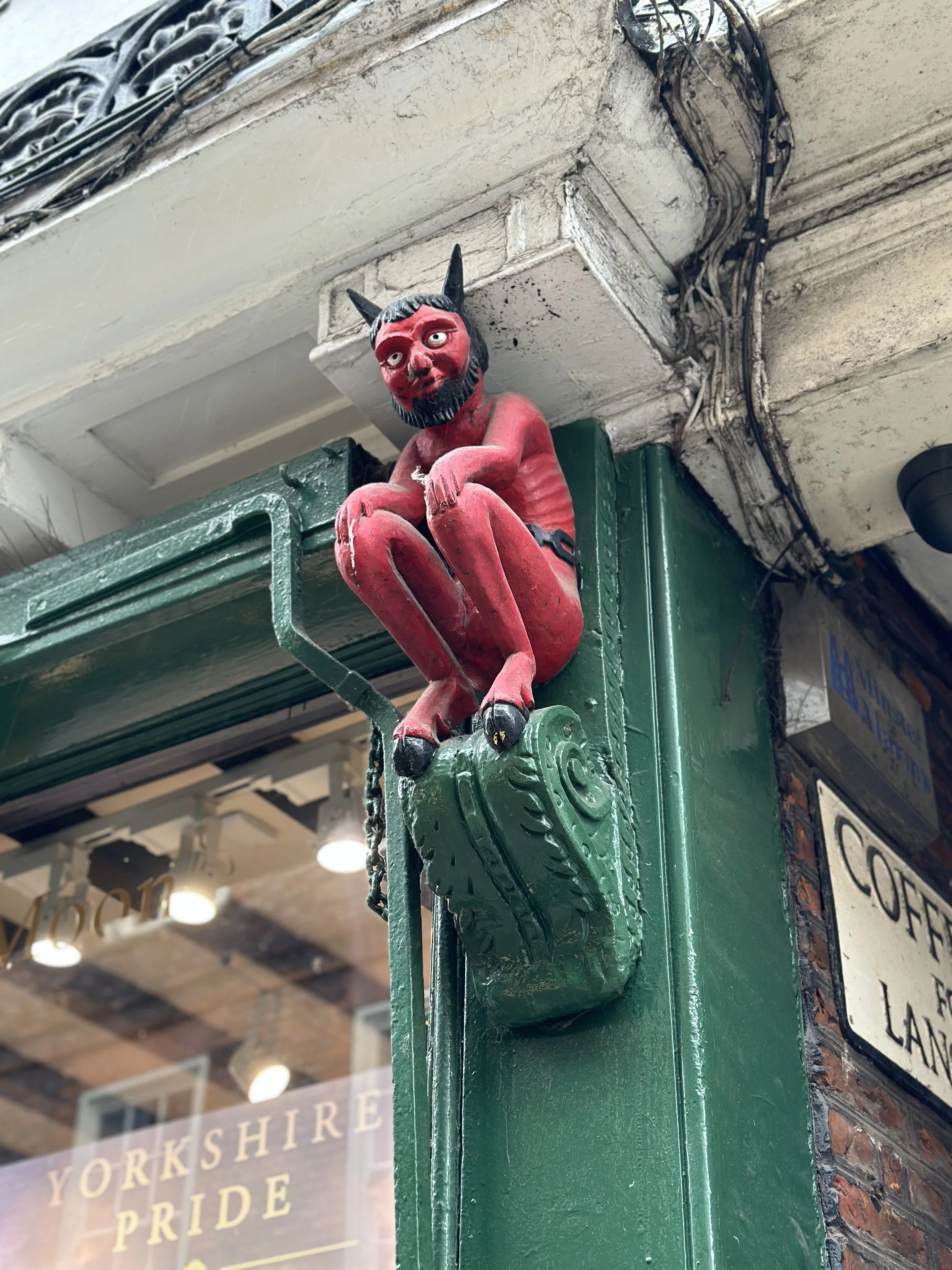 At No. 33, Stonegate, a red devil was showcased to advertise the local printing press. The symbol of a demon was often associated with this occupation for several reasons: 1. The operators of the press would often have blackened fingers, due to working with ink, and thus were associated with dark arts; and there were errors in grammar, spelling, and punctuation oftentimes (due to human error). Thus, they used the term “printer’s devil” to describe these “hazards”.