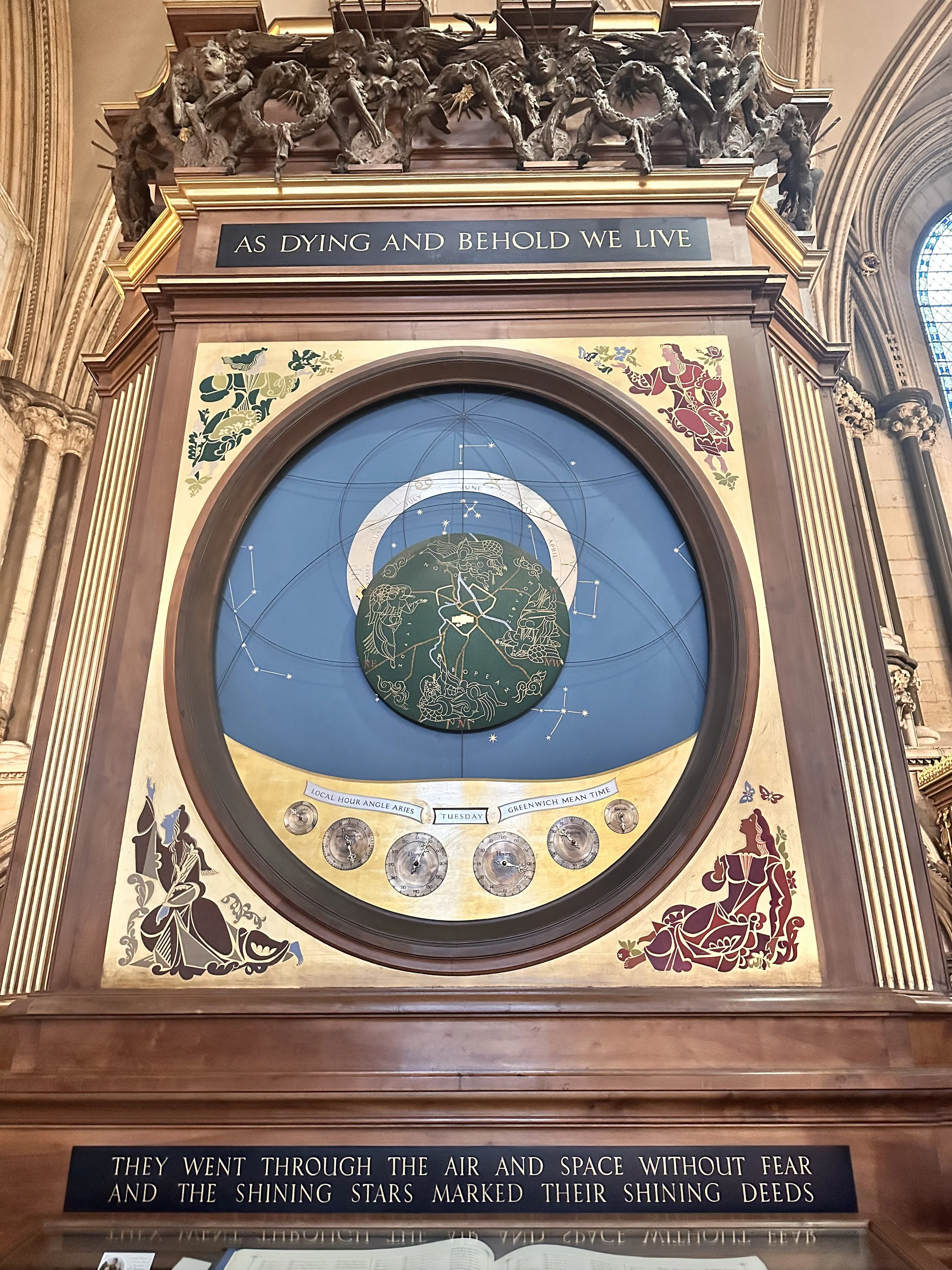 Hidden in the north transept of York Minster is a grand clock depicting the motion of the Sun and Stars around a map of the city of York, at the center, with the Minster highlighted in gold leaf. It was designed and created by Dr. R. d’E. Atkinson of the Royal Greenwich Observatory, in 1955, to commemorate the 18,000 airmen (from the area) who fought for the Royal Air Force during WW II.